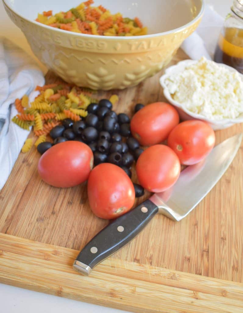 6. Add diced tomatoes, sliced olives, and crumbled feta cheese to big bowl, mix.